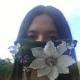 Dit masker heb ik gemaakt van een stuk karton waarop ik voor de achtergrond er groene bladeren heb op gemaakt en daarna heb ik er verschillende soorten bloemen op gemaakt.